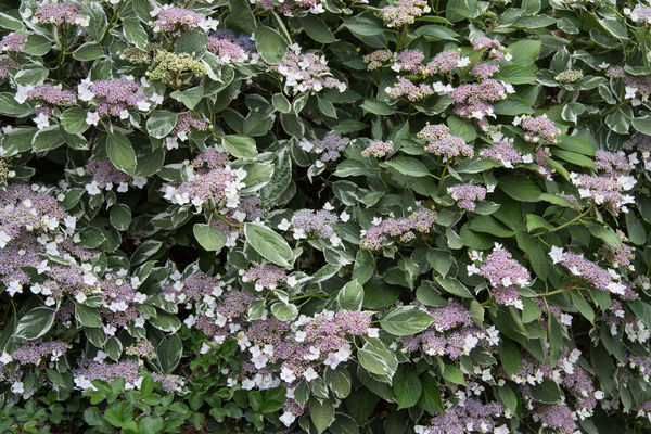 - Clusters of blooms feature white variegation: white outside, pink or blue inside depending on soil pH.